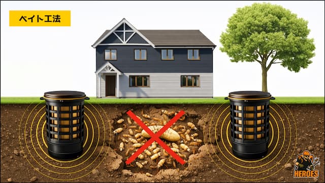 ベイト工法とは、シロアリが好む餌に薬剤を混ぜ、建物周囲に設置して巣ごと駆除する方法です。