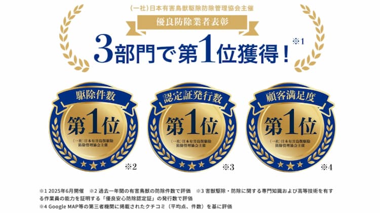 | 特徴 | 日本有害鳥獣駆除・防除管理協会に加盟 協会認定の専用薬剤を使用 |